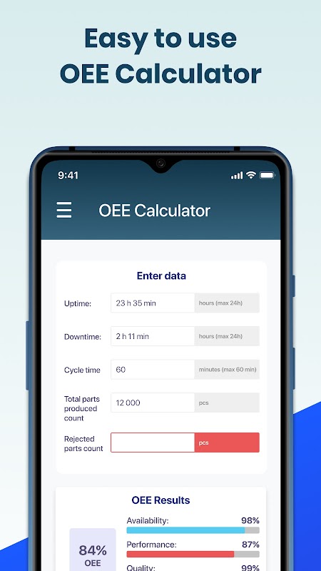 از نسخه 1.1 این برنامه ویژگی هایی را برای کاربرانی که حساب کاربری ندارند فراهم می کند. می توانید نظریه ای را بخوانید که پشت معیار OEE قرار دارد و OEE را با استفاده از یک ماشین حساب ساده و آسان محاسبه کنید.