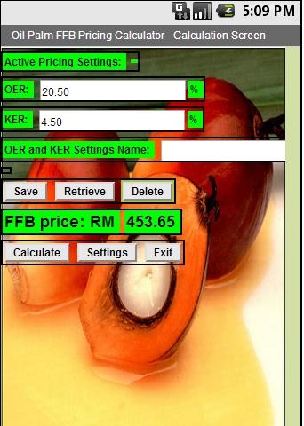 ابزار قدرتمند برای همه بازیکنان بازار در صنعت روغن نخل باید داشته باشند. مفید برای صاحبان مزرعه روغن نخل برای محاسبه که آیا آنها در حال دریافت قیمت عادلانه برای FFB خود عرضه شده به کارخانه های تولید. همچنین برای املاک و آسیاب مدیران برای بودجه قیمت گذاری FFB و محاسبات مفید است. نمایندگی های FFB و میوه روغن نخل بازاریابان می توانند از ماشین حساب برای مجموعه ای رقابتی FFB قیمت خرید استفاده کنید. این نسخه پرداخت می شود برنامه را قادر می سازد تا کاربر را به صرفه جویی در قیمت های نامحدود، تنظیمات OER و KER و برای دانلود شدن MPOB منتشر شده قیمت ماهانه به طور متوسط برای محاسبه.