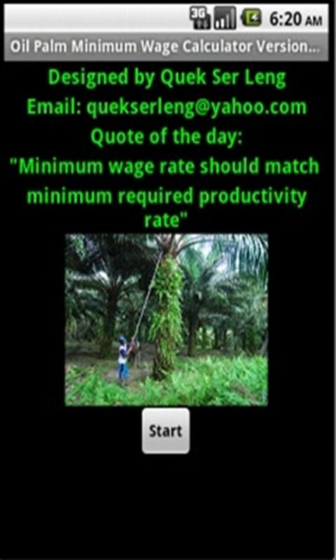 این برنامه ماشین حساب برای محاسبه نرخ جدید دستمزد برای کار روغن نخل قطعه مزرعه بندی در انطباق با حداقل دستمزد ترتیب 2012 اجرا شده توسط وزارت منابع انسانی، مالزی است که به از 2013 ژانویه 1 موثر باشد طراحی شده است. این ماشین حساب است مفید و ابزاری برای روغن نخل مدیریت مزرعه و همچنین حسابرسان داخلی برای مزارع روغن نخل در مالزی به تنظیم و یا تایید حداقل دستمزد برای کار قطعه بندی که در انطباق با سفارش حداقل دستمزد بازتابی از استاندارد روزانه و همچنین باید، باید نرخ بهره وری مورد نیاز برای هر قطعه بندی کار. این ماشین حساب قابل استفاده برای کشت و زرع روغن نخل در صباح، ساراواک و شبه جزیره مالزی است.
