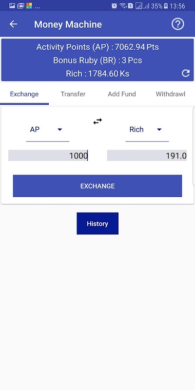 ماشین پول در برنامه به شما کمک می کند تا AP و (Bonus Ruby) BR خود را با پول (Rich) به حساب خود مبادله کنید. ثروتمندان را می توان با بالاپرداخت تلفن همراه رد و بدل کرد یا به حساب بانکی آنها ارسال کرد. همچنین می توانید از ریچ برای خرید آنلاین استفاده کنید و کارهای بیشتری انجام دهید.
