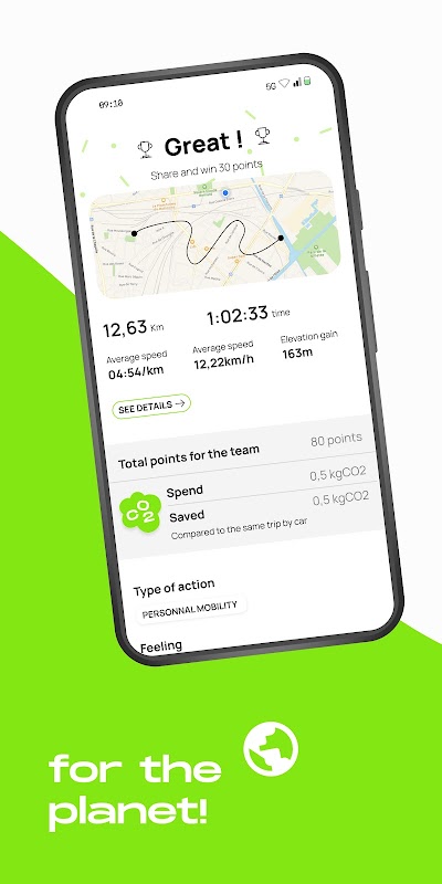 رابط کاربر پسند این برنامه به شما این امکان را می دهد که به راحتی در برنامه حرکت کنید. آزمون ها، چالش ها، ماموریت ها و وظایف همبستگی به راحتی از صفحه اصلی قابل دسترسی هستند. حالت "دکربونایزر" صرفه جویی در انتشار CO2 را محاسبه می کند که هنگام تغییر حالت حمل و نقل برای سفرهای حرفه ای خود به دست می آورید. می توانید برای ایجاد انگیزه در یکدیگر با همکاران خود پیام های خصوصی یا تیمی مبادله کنید. شما به آمار تمام فعالیت های خود دسترسی خواهید داشت. در نهایت، در هر زمان، یک رتبه بندی جهانی موقعیت تیم شما را نشان می دهد.