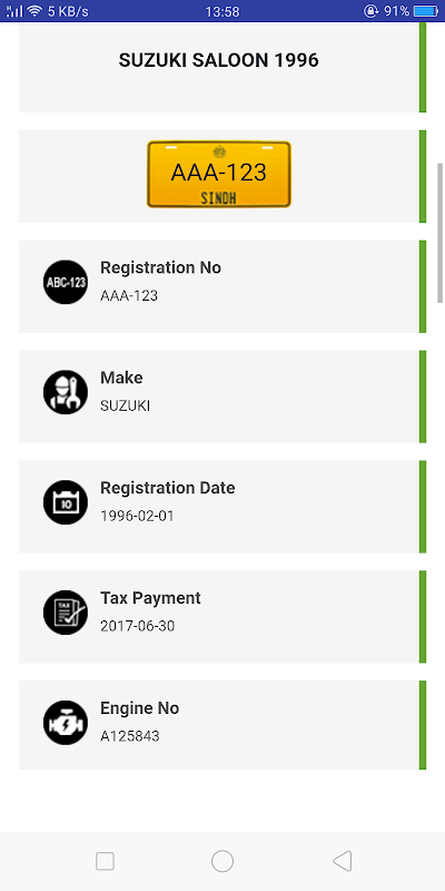 This app Will Give you Information of Vehicles such as Car, Motorcycle (bike) etc. for the following places. And data is extracted from Excise & Taxation Motor Registration Wing and MTMIS from the Government of KPK, Sindh, Punjab, Gilgit and Islamabad.