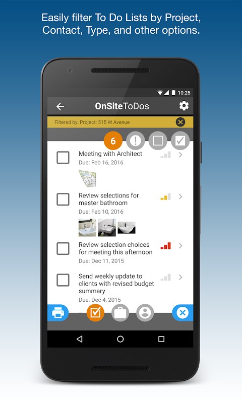 Construction is chaotic - the newly redesigned OnSite ToDos turns that chaos into progress with easy and manageable to do lists, right at your fingertips. Users can quickly create new tasks, set due dates, status and priority, organize tasks by project, and delegate responsibility to other team members - all with the touch of a few buttons.