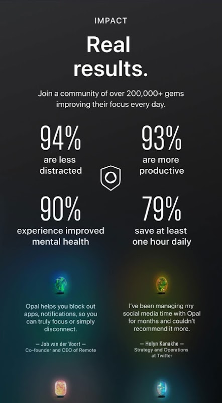 4 hours. That’s the average time you’ll spend looking at your phone today. With a combination of app restrictions, real time feedback and rewards, you can begin to focus better and accomplish your dreams, just like Opal’s members.