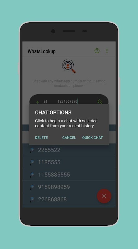 You received a call or message or notification from an unknown number and you wanted to know if they have whatsapp to decide yourself, all you have to insert the country prefix and phone number in the application and click for lookup. App will open the unknown number in WhatsApp - This works without saving the contact on your phone's address book and you can begin chatting with unknown number and keep track of recent history.