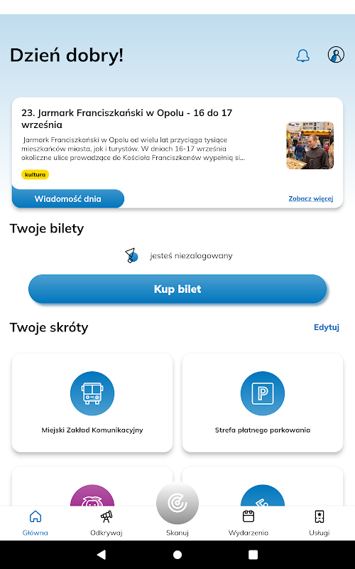 برای استفاده از برنامه بدون محدودیت، ارزش ایجاد یک حساب کاربری در وب سایت https://opoleplus.pl/ یا ثبت نام مستقیم از برنامه را دارد. کاربرانی که وارد سیستم شده اند می توانند از تمام قابلیت های موجود استفاده کنند. بدون ورود به سیستم، موتور جستجوی رویداد، اخبار و اطلاعات کلی خدمات، بدون امکان خرید بلیط در دسترس است.