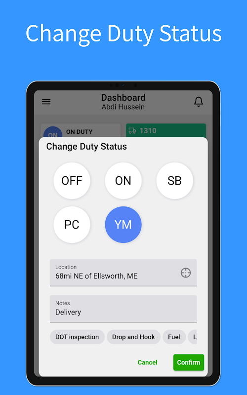 برنامه ما با در نظر گرفتن رانندگان طراحی شده است و نیازهای آنها را با ایجاد برنامه با هشدارها، رابط کاربری آسان و نمادهای بزرگ اولویت بندی می کند. اکثر عملکردها را می توان تنها با چند ضربه در دسترس قرار داد و از سادگی و راحتی اطمینان حاصل کرد. ما درک می کنیم که دستور ELD می تواند پیچیده باشد، اما ما به طور مداوم در تلاش هستیم تا انطباق FMCSA را برای رانندگان ساده کنیم.