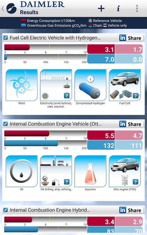 The result of the calculation is presented as a comparison between a current gasoline-fueled compact car and the accomplished selection.