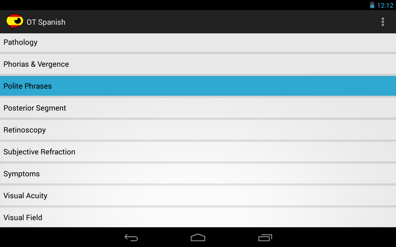 بینایی سنجی مترجم اسپانیایی برای آندروید یک مترجم حرفه ای تلفن همراه برای پزشکان مانند چشم، چشم پزشکان، پزشکان، تکنسین بینایی، و دیگر ارائه دهندگان مراقبت های بهداشتی است. این است که به سادگی سریعترین روش برای برقراری ارتباط با بیماران زبان اسپانیایی در معاینه چشم. عبارات به دسته بصری برای دسترسی سریع به عبارت سمت راست در زمان مناسب تقسیم شده است. ضبط با کیفیت بالا از تمام دستورالعمل های بالینی اولیه لازم در حال حاضر در نوک انگشتان خود را در یک محل مناسب.