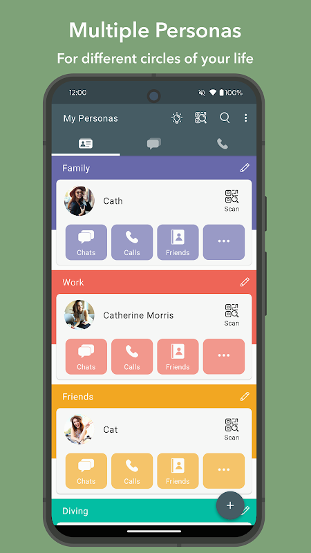 هر شخص توسط دیگران به عنوان یک نمایه کاملاً متفاوت دیده می شود. شما می توانید نحوه ارائه خود را تنظیم کرده و هر رابطه را مدیریت کنید. شما می توانید هنگام پیام رسانی یا تماس با مخاطبان با استفاده از شخصیت های مختلف ، از حریم خصوصی خود محافظت و کنترل کنید و همچنین تنظیمات برگزیده خاصی را برای هر شخص اعمال کنید.