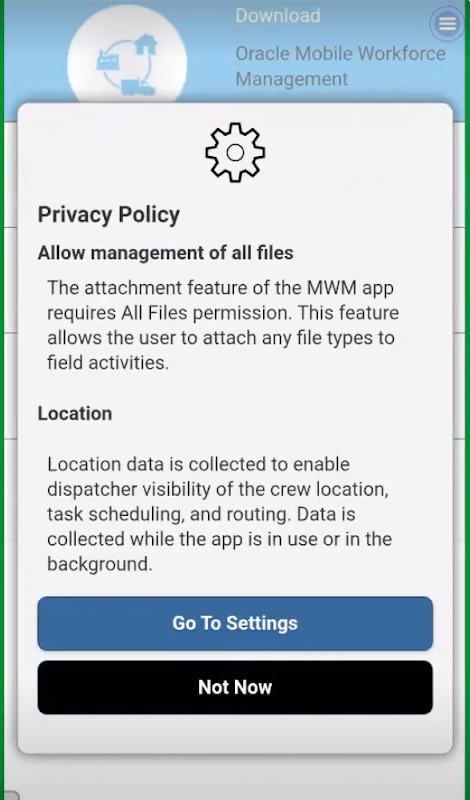 Oracle Mobile Workforce Management (MWM) یک برنامه تلفن همراه است که با Oracle Utilities Mobile Workforce Management و Oracle Real-Time Scheduler (ORS) کار می کند. ارتباطات بیدرنگ بین شما بهعنوان کارگر یا پیمانکار و MWM/ORS برقرار میکند، برنامه روزانه و دستورالعملهای مسیریابی شما را از روی نقشه ارائه میکند، به شما در مورد هر گونه مشکل هشدار میدهد و به شما امکان میدهد تکالیف کاری خود را تکمیل کنید. کاربران باید بتوانند مشاهده/پیوست کردن اسناد (برگ های خطر و ایمنی، اسناد طراحی، داده های تجهیزات، ...) به تکالیف کاری برای انجام صحیح کارشان. پیوست کردن و مشاهده فایل ها از سیستم فایل یک بخش مهم از عملکرد برنامه است، مجوز دسترسی به همه فایل ها برای اجرای این برنامه اجباری است. ارتباط مداوم به شما امکان می دهد به صورت آفلاین کار کنید و پس از بازگشت به محدوده، مجدداً همگام سازی می شود. این برنامه با نسخه های MWM / ORS 2.3 و بالاتر سازگار است. به خط مشی رازداری Oracle در https://www.oracle.com/legal/privacy/privacy-policy.html مراجعه کنید.
