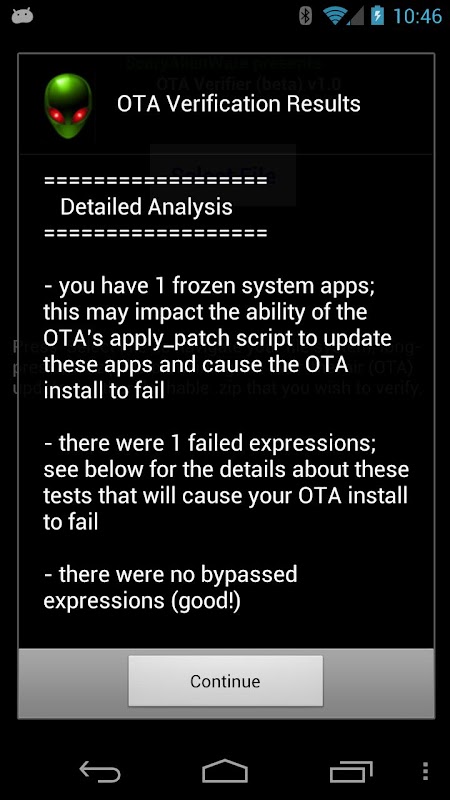 3. توجه داشته باشید: این یک با توجه به اینکه یک خطا گزارش شده توسط این برنامه همچنین بدان معنی است که OTA شکست مواجه خواهد شد را نصب کنید. من از دیدن جدیدتر (اندروید 5+) OTAs که Updater را-اسکریپت شامل پس از نصب چک SHA1 خواهد شد که به عنوان شکست (عبارات نادرست) گزارش شده توسط این برنامه است. من (v2.5) جدید "حالت سخت" اولویت / تنظیم است که "اجازه" فایل های غیر موجود به بیان خود اشاره شده در ارزیابی را به غلط (که در غیر این صورت) اضافه شده است. نسخه 2.6 به ارمغان می آورد منطق اضافی که مسئولیت رسیدگی به این نصب ارسال چک SHA1 با اجازه دادن به آنها را به عنوان false برگرداند نیست که بعد از دیدن "تایید فایل های سیستم پارتیشن" بیان ui_print شناسایی شده است.