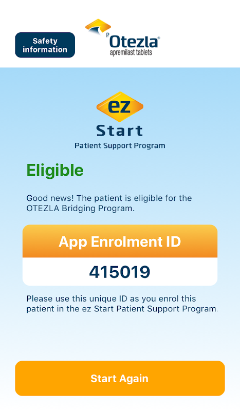 The ez Start Bridging Program app allows healthcare professionals like you to determine patients’ eligibility for our bridging program, which means patients can start on PrOTEZLA® (apremilast) without needing to wait to confirm private coverage eligibility.