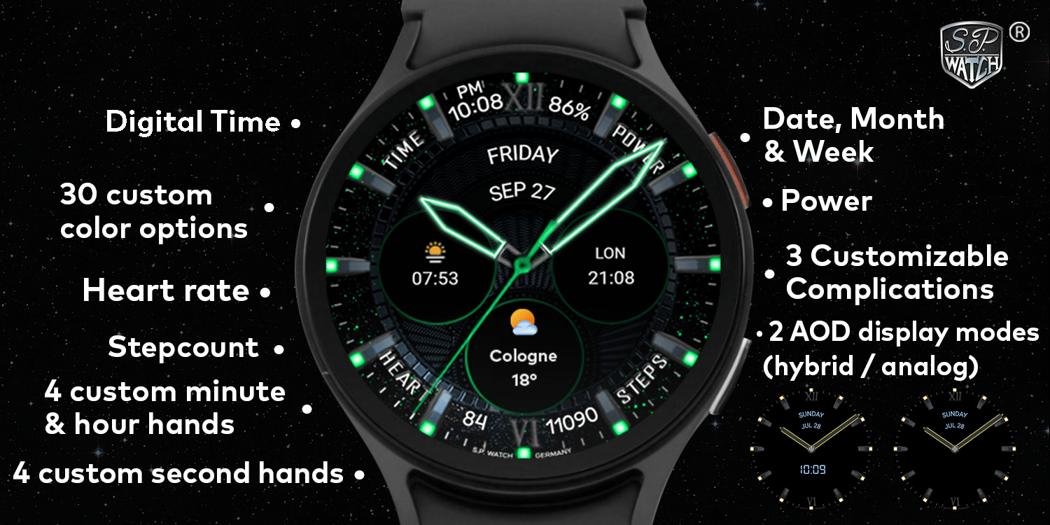 این واچ فیس قابل تنظیم است و دارای 30 سبک رنگ به همراه 3 پیچیدگی قابل تنظیم و 4 عقربه ساعت قابل تنظیم است. این ساعت به گونه ای طراحی شده است که انعطاف پذیری برای شخصی سازی ظاهر ساعت هوشمند خود را برای مطابقت با سلیقه شخصی کاربران فراهم کند.