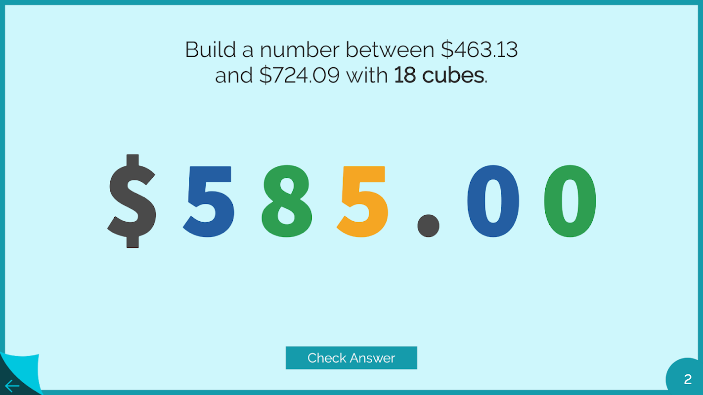 - بسازید: از دانش آموزان خواسته می شود تا با قرار دادن مکعب در برج های Cube یک عدد مورد نظر را ایجاد کنند.