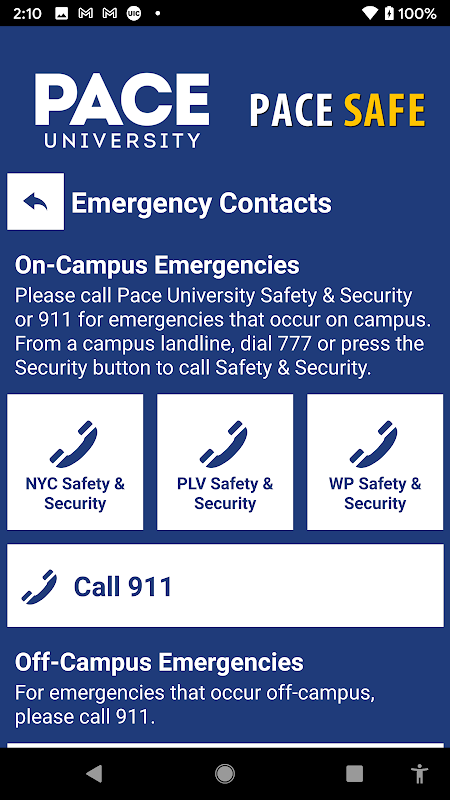 - تماس اضطراری: با خدمات صحیح برای منطقه دانشگاه Pace در موارد اضطراری یا غیر اضطراری تماس بگیرید