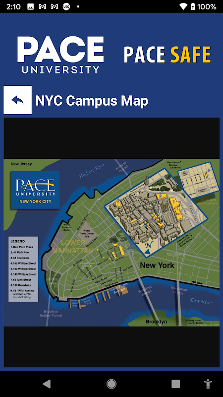 Pace Safe برنامه ایمنی رسمی دانشگاه Pace است. این تنها برنامه است که با سیستم ایمنی و امنیت دانشگاه Pace ادغام شده است. ایمنی و امنیت برای توسعه یک برنامه منحصر به فرد که دانشجویان، اعضای هیات علمی و کارکنان را با ایمنی بیشتری در محوطه دانشگاه Pace ایجاد کرده است، کار کرده است. این برنامه به شما هشدار ایمنی مهم را ارسال می کند و دسترسی سریع به منابع ایمنی پردیس را فراهم می کند.
