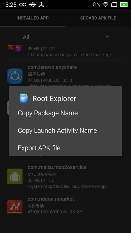 Include package name, label, size, versionCode, versionName, launch Activity name, apk file path. Can copy this info to Clipboard and export APK file to SDCard.