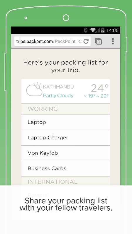 هنگامی که لیست بسته بندی شما ساخته و سازماندهی شده است، PackPoint آن را برای شما ذخیره می کند و سپس می توانید آن را با دوستان و خانواده خود به اشتراک بگذارید در صورت نیاز به بسته بندی نیز نیاز دارید.