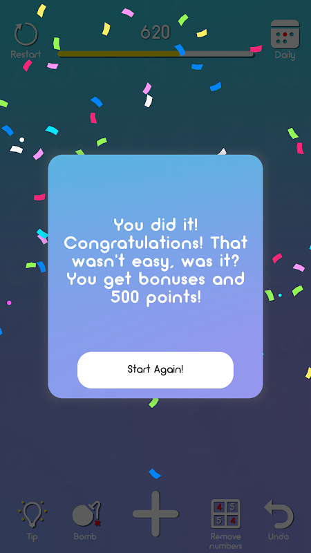 قوانین بازی ساده است: شما باید تمام اعداد را با حذف جفت ارقام یکسان یا جفت هایی که در مجموع 10 می دهند، از زمین بازی حذف کنید. اگر ترکیبی برای حذف وجود نداشته باشد، تمام اعداد باقی مانده از آخرین خانه نوشته می شوند. و به همین ترتیب تا زمانی که تمام اعداد از قسمت حذف شوند.