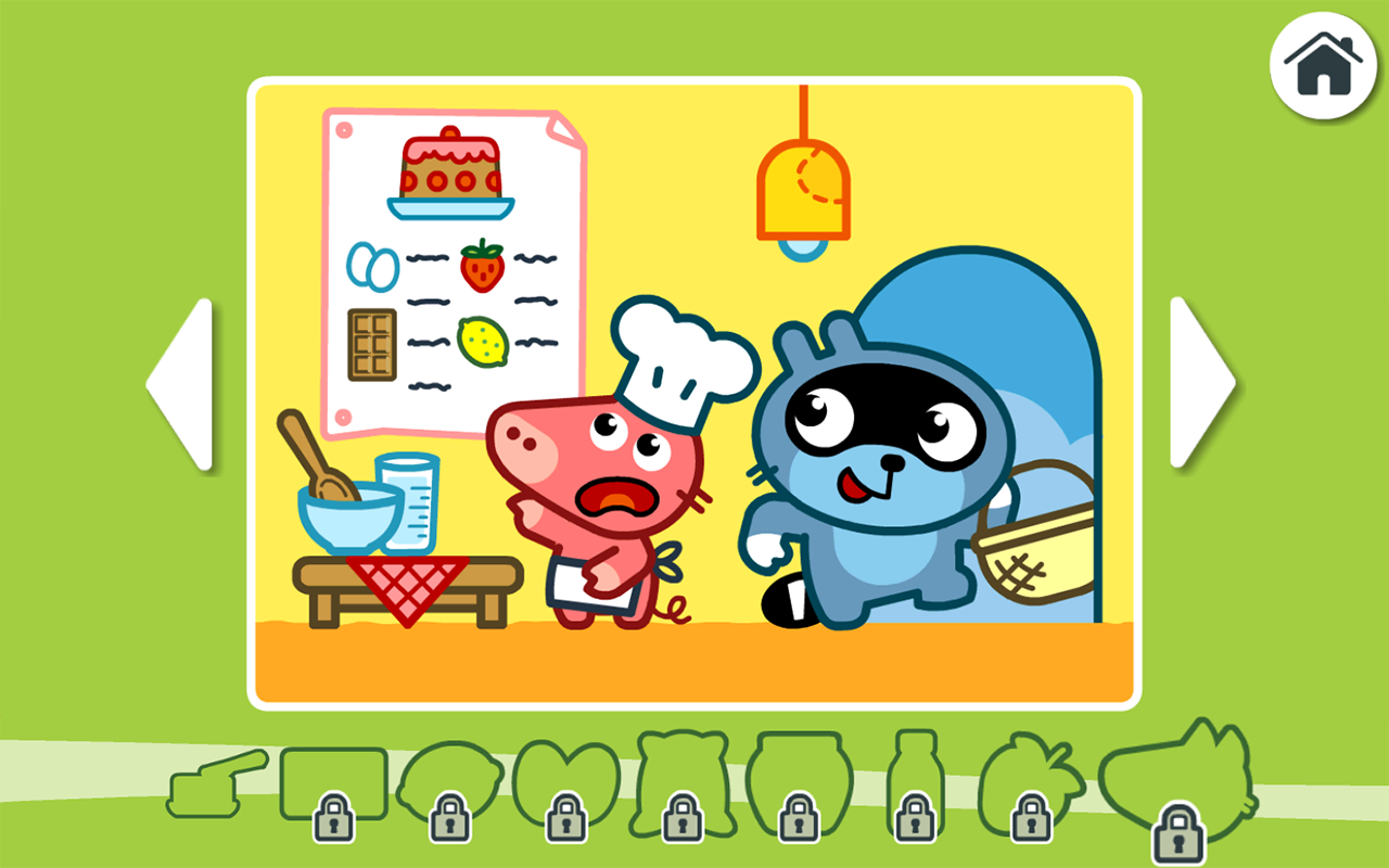 مهر برای Pango باید برای بازگرداندن 8 مواد تشکیل دهنده به آشپزخانه خوک، 8 ابزار برای موشک فاکس، تجهیزات ورزشی برای سنجاب، و مداد رنگی برای نقاشی خرگوش ...