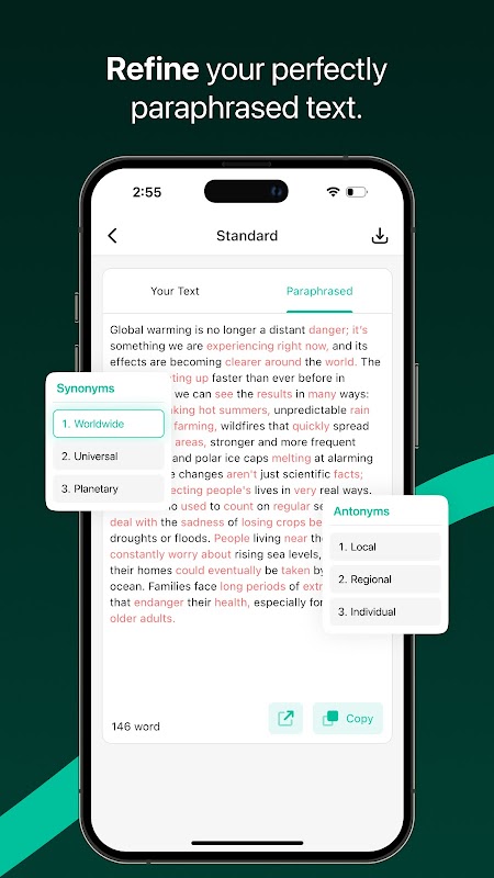 4. روی دکمه "پارافریز" کلیک کنید— و در عرض چند ثانیه، متن جدید شما آماده خواهد شد، همراه با مترادفها و متضادهای هر کلمه.