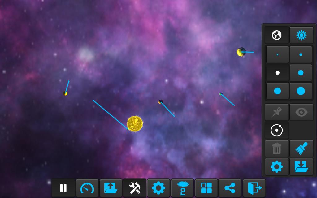 Build complete solar systems with suns, planets, moons and asteroids, spinning and twirling in space, held together just by the attraction of their gravity. Watch as you introduce a rogue planet and see the mayhem unfold as its gravity disrupts your carefully balanced particle model!