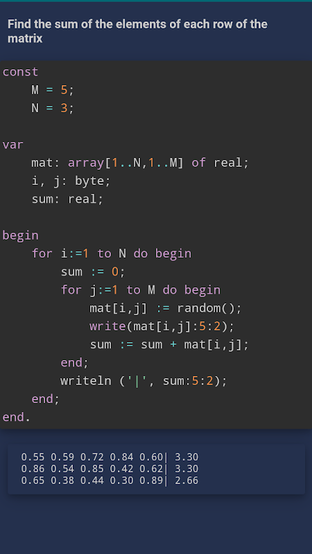 مجموعه تمرین ها و مشکلات با یک راه حل برای زبان برنامه نویسی پاسکال. کارها با موضوعات "الگورهای خطی" ، "شرایط" ، "حلقه" ، "آرایه ها" ، "ماتریس" ، "رشته ها" ، "پرونده ها" ، "توابع" گروه بندی می شوند. هر موضوع بعدی نیاز به دانش مطالب قبلی دارد ، اما برعکس. بنابراین "شرایط" شامل کارهایی با چرخه نیست. با این حال ، موضوع "چرخه ها" شامل کارهایی است که هم دارای چرخه و هم شرایط هستند.