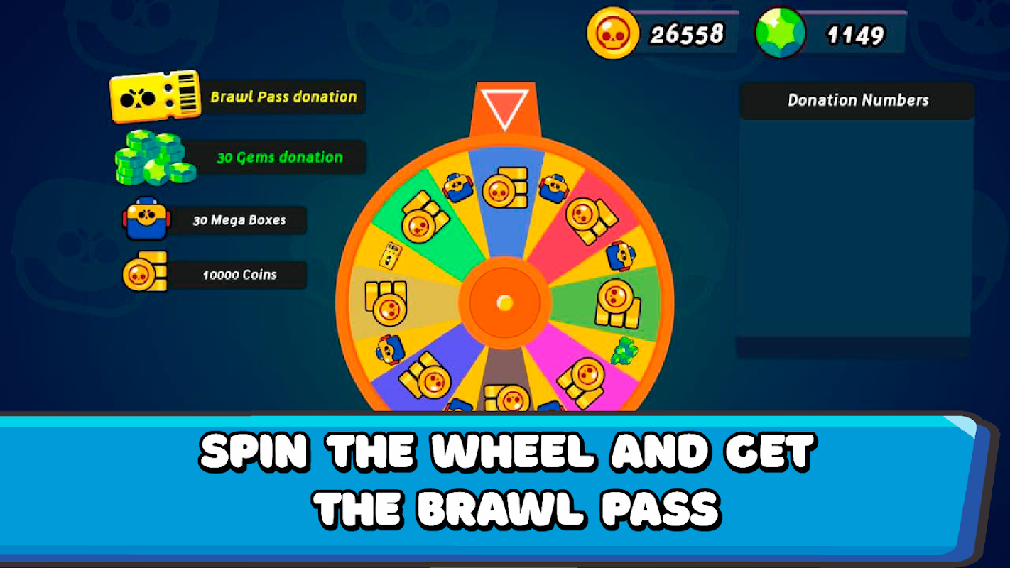- You can try the wheel and pick up something from it: 30 mega-boxes, 10000 coins, 30 gems or the brawwl passs!