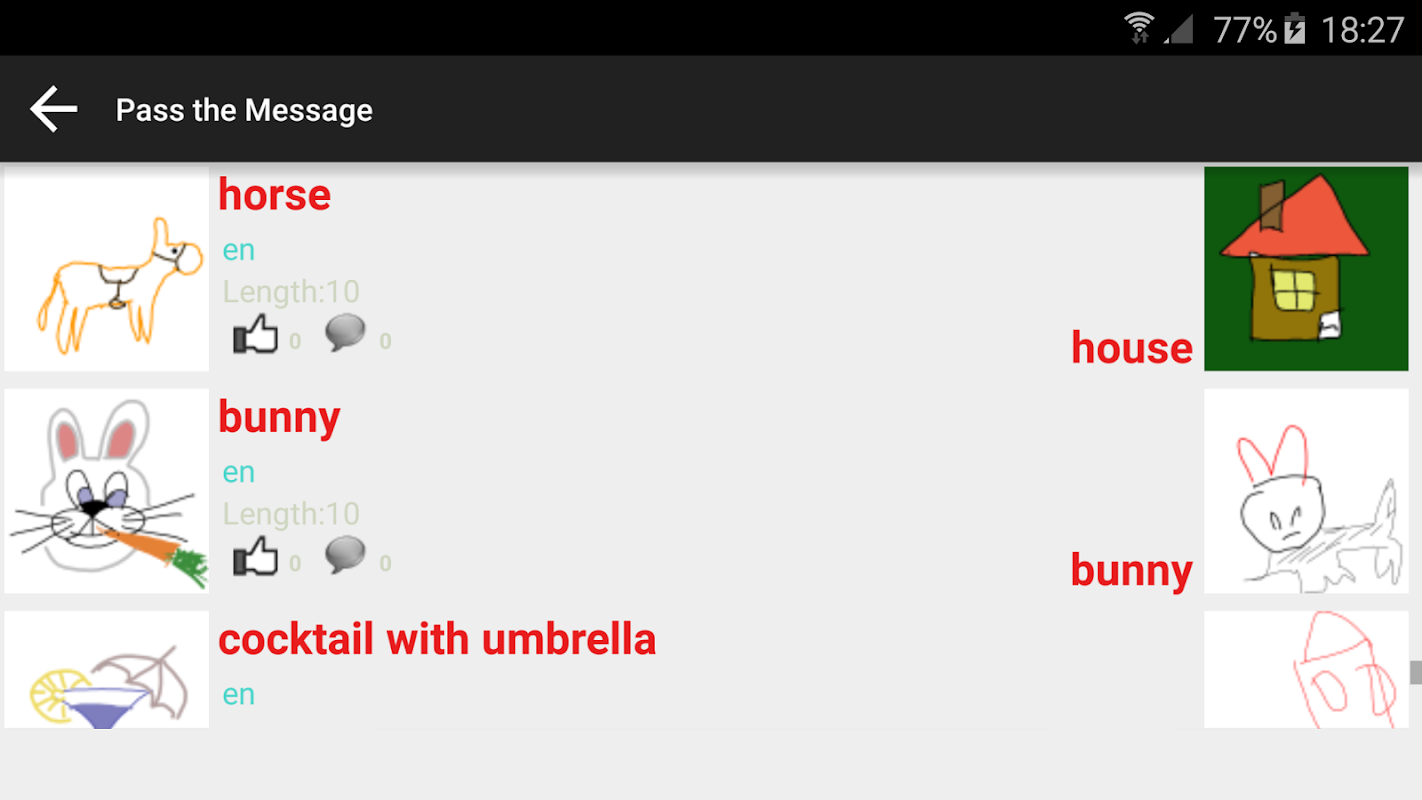 Pass the Message is a multiple player game of drawing and guessing. This game is also known as Pictionary Telephone or Chinese Whispers. The goal is to create an alternating list of pictures and text descriptions which change the original message to something completely different.