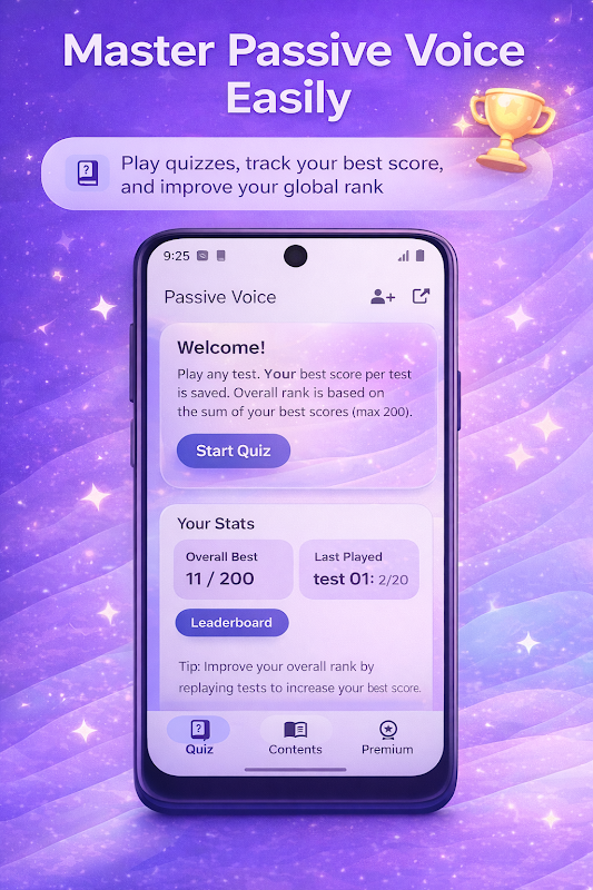 این برنامه به شما کمک میکند تا یاد بگیرید چگونه جملات را از معلوم به مجهول (و برعکس) در زمانهای رایج تبدیل کنید، با بازخورد فوری و توضیحات واضح از طریق تمرین.
