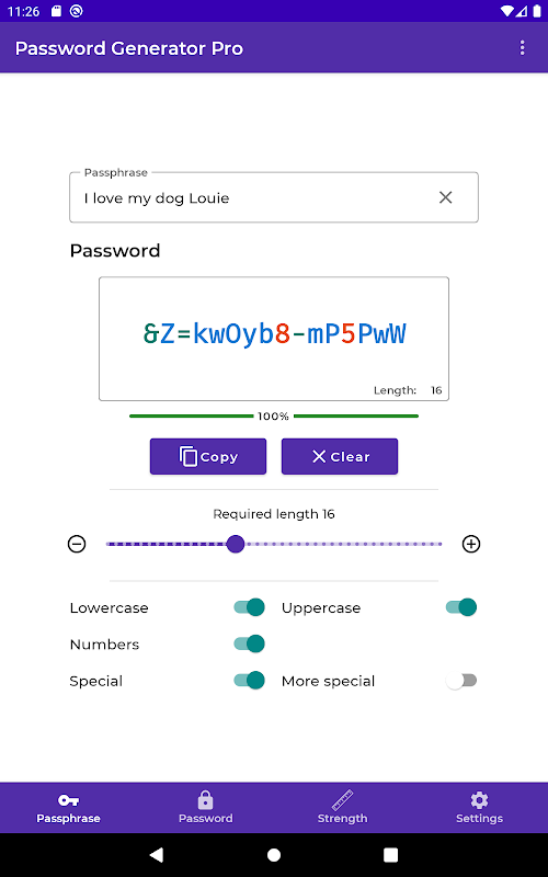 Password Generator Pro را می توان برای استفاده از هر ترکیبی از حروف کوچک، حروف بزرگ، اعداد، کاراکترهای خاص (-، _، $، #، و، ٪، +، =) یا حتی کاراکترهای خاص تر (!، ?،) سفارشی کرد. (،)، ~، ^، [،]، {، }، /، \، |، <، >).