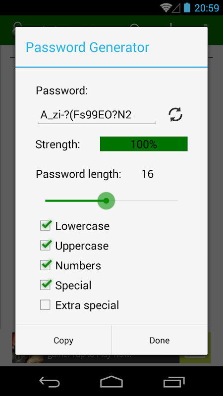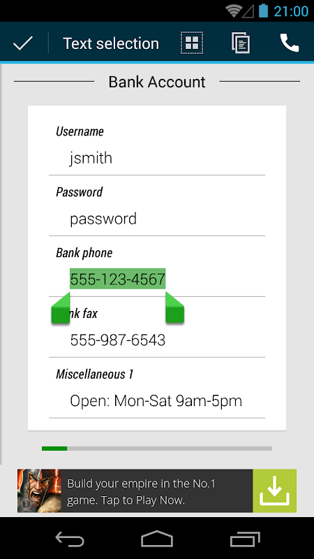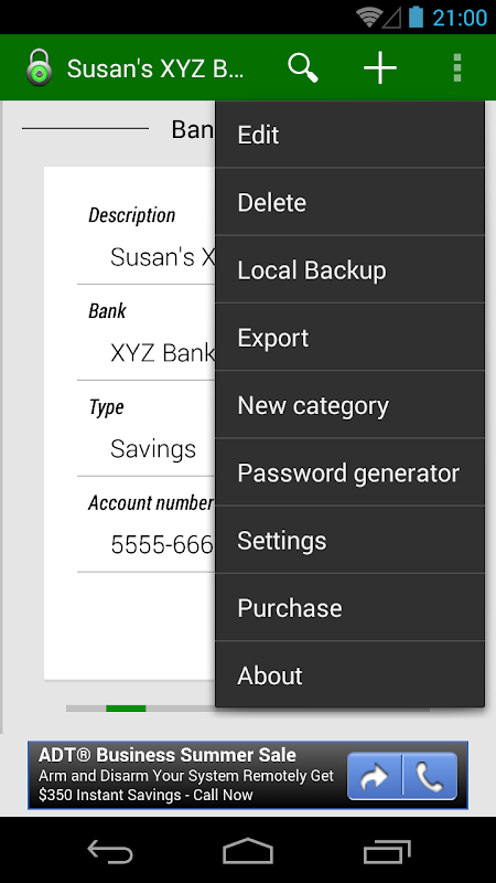 Password Manager allows you to export your data to the SD card so you can keep a copy handy. Furthermore, this exported data can be password protected to prevent unauthorized access to your data.