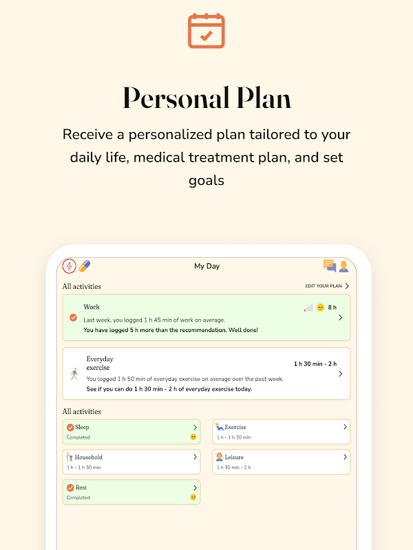 - برنامه های شخصی: برنامه های سفارشی متناسب با زندگی روزمره، برنامه درمان پزشکی و اهداف تعیین شده را دریافت کنید. برنامه را در طول روز بر اساس نیازهای خود تنظیم کنید و مشاهده کنید که چگونه می تواند بر سطح درد پیش بینی شده شما تأثیر بگذارد.
