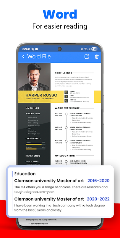 * پشتیبانی از فرمتهای آفیس: علاوه بر فایلهای PDF، این برنامه از باز کردن فایلهای DOCX، XLSX و PPTX پشتیبانی میکند و به شما امکان میدهد اسناد Word، Excel و PPT را مستقیماً در تلفن خود مشاهده کنید.