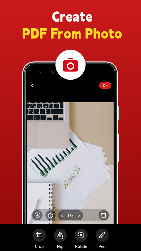 از عکسها 📸: روی نماد «Photo to PDF» ضربه بزنید، تصاویر را بگیرید و آنها را به عنوان یک سند PDF ذخیره کنید.