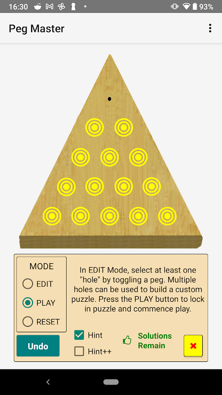 * PLAY - به طور مداوم تمام راه حل های باقی مانده را پس از هر حرکت دوباره محاسبه می کند. دو سطح HINT ارائه شده است. UNDO نامحدود.