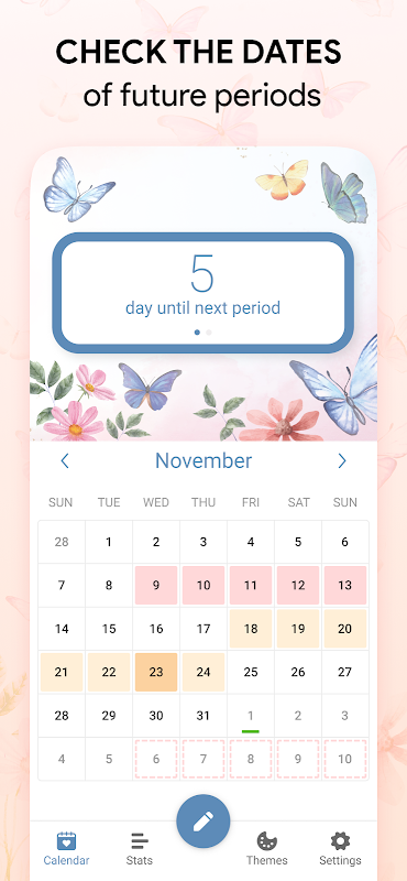 - تقویم پیشنمایش برای روزهای پریود آینده و ردیابی روزهای باروری