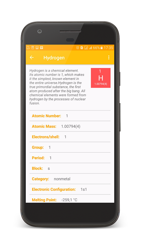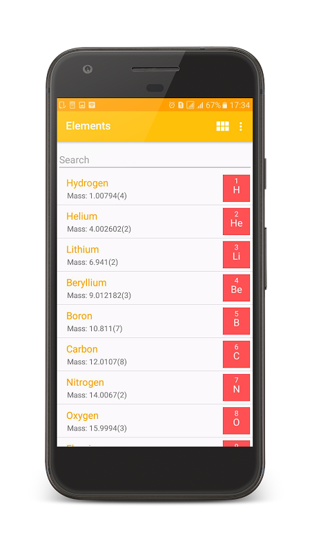 برنامه نشان می دهد عناصر در دو طرح بندی؛ جدول تناوبی (شبکه) و به عنوان فهرست.
