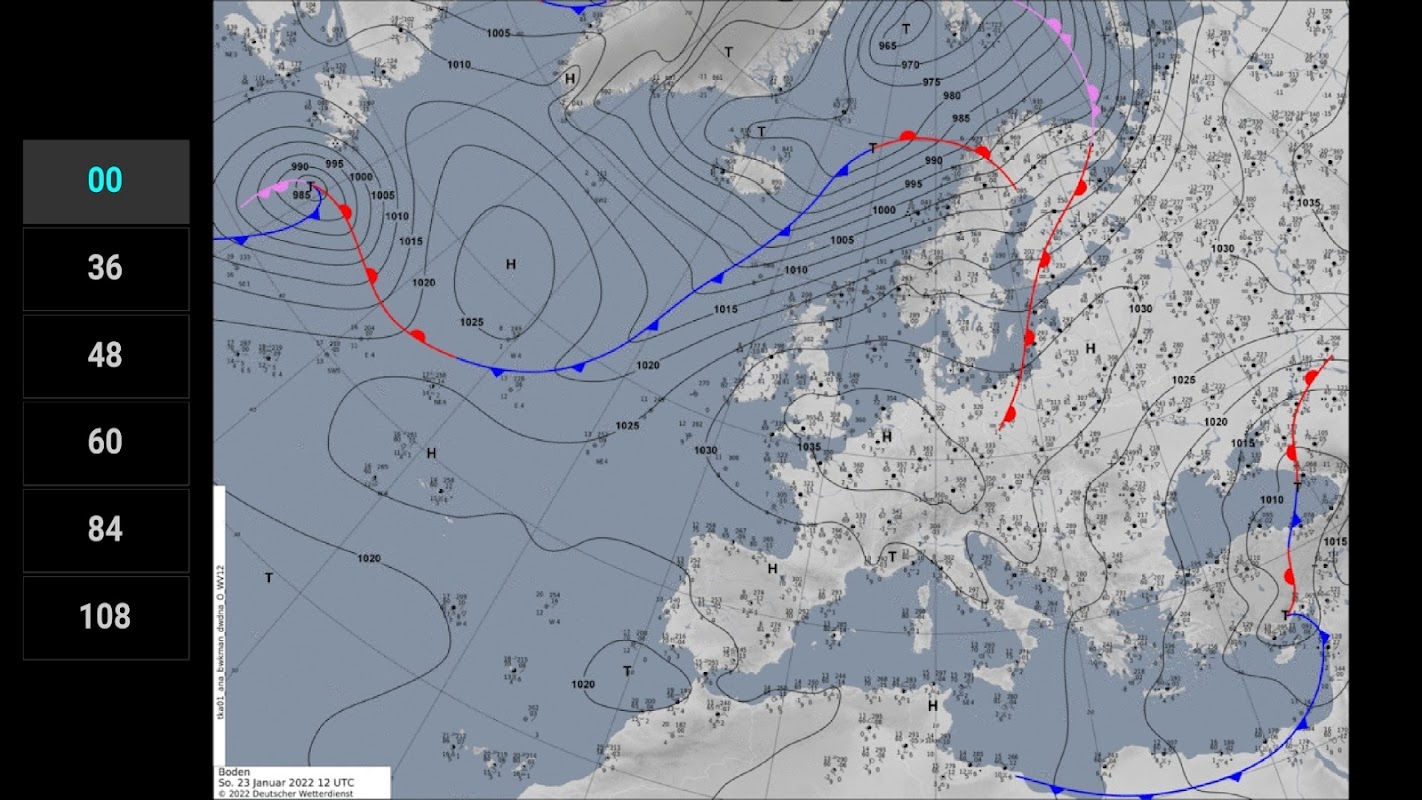 برای برنامه ریزی صحیح پرواز، اطلاعات در مورد شرایط هواشناسی ضروری است. برنامه نمودارهای پیش بینی فشار سطحی چشم انداز 5 روزه ای را در مورد توسعه احتمالی شرایط هواشناسی در مقیاس بزرگ در اروپا به شما ارائه می دهد.