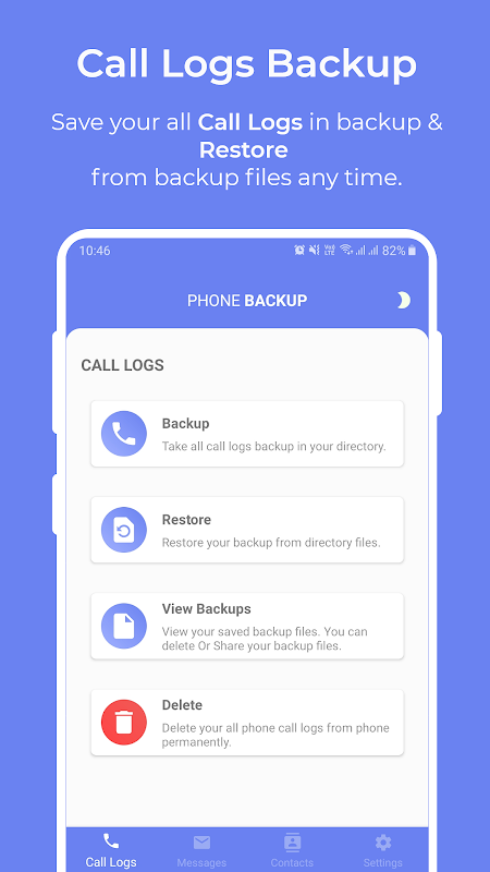 پشتیبانگیری تلفن برنامهای است که از گزارش تماسها، پیامها و مخاطبین شما در فضای ذخیرهسازی بسته داخلی گوشی و ذخیرهسازی درایو Google برای پشتیبانگیری و بازیابی کامل هر زمان که بخواهید به حالت اولیه بازیابی کنید، نسخه پشتیبان تهیه میکند.