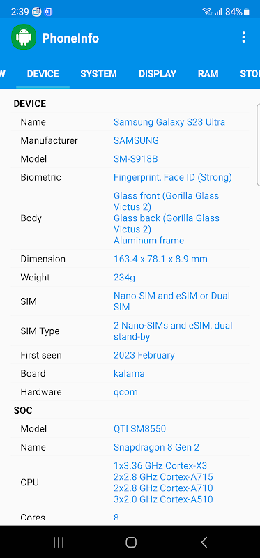 - اطلاعات سیستم که شامل برند و مدل دستگاه، وضوح صفحه نمایش، رم و ظرفیت ذخیره سازی است.