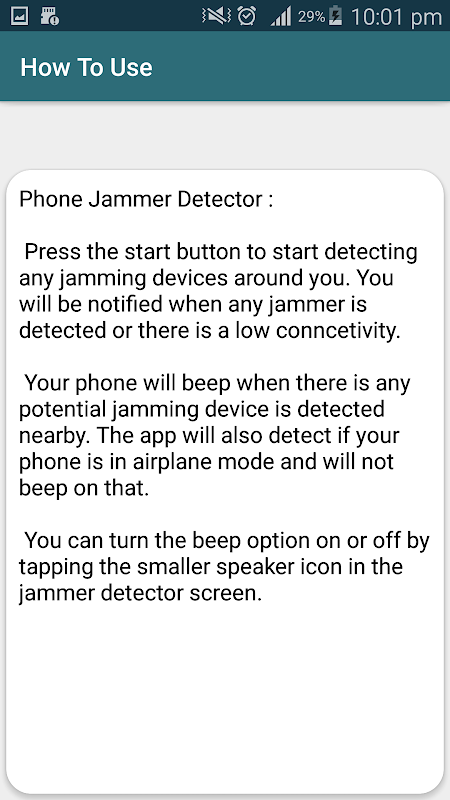 This jammer detector is a free application which enables you to detect gsm signal jammers and also let you find out the gsm signal strength of your phone. The alarm system tells you when you are near a phone jammer or there is a loss of signal near you.