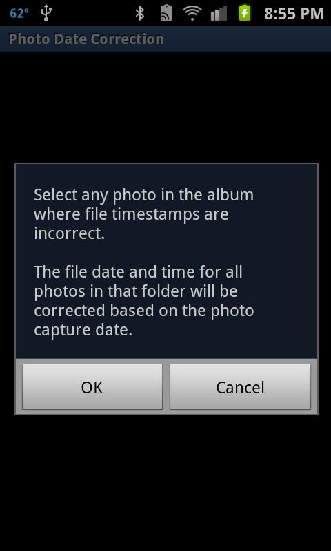This app looks up the EXIF tags of photos and if the timestamp has been saved, replaces the timestamp of the file with this date and time indicating when the photo was actually taken. It operates on one folder at a time and given the integration with Android Gallery to choose the folder, you will have to pick a photo within the intended album to update the timestamp of all photos in that folder.