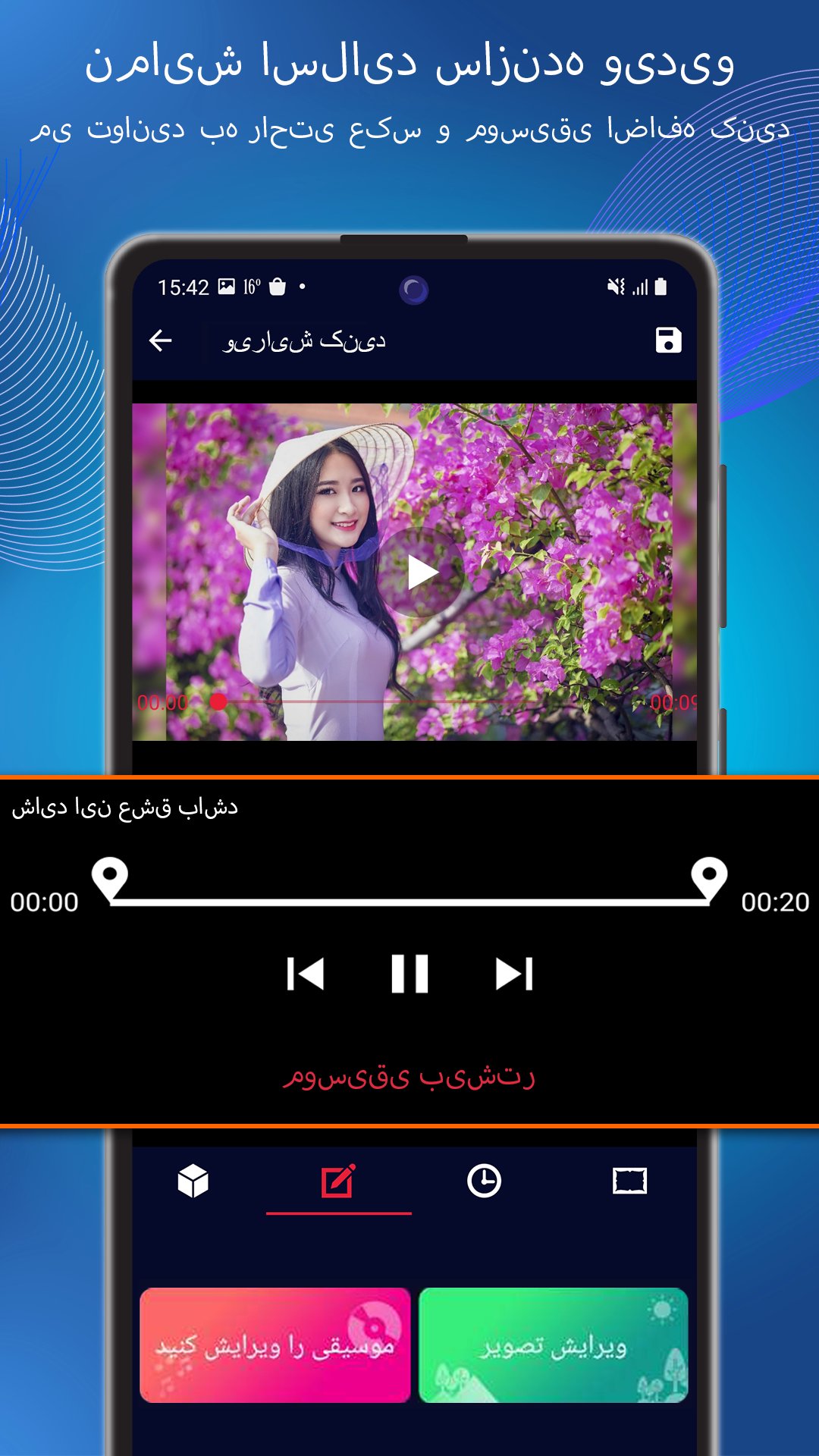 * نمایش اسلایدی قاب و زمان: تعداد زیادی فریم زیبا و متنوع برای ویدیوی شما بی نظیر است. همچنین می توانید با انتخاب مدت زمان نمایش پرده ای سرعت و یا سرعت فیلم را ویرایش کنید.