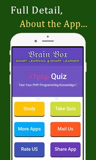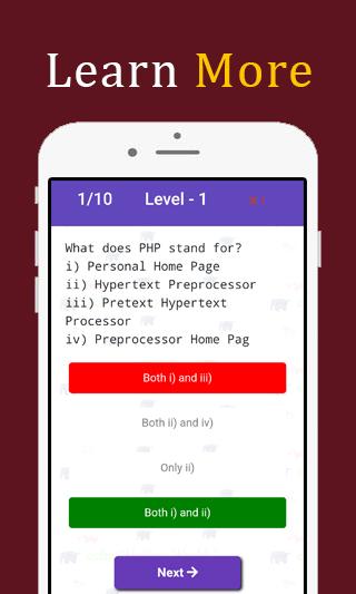 با رفتن به آزمون / مسابقه و تلاش برای سوالات، کاربر می تواند دانش برنامه نویسی پی اچ پی خود را بهبود بخشد و می تواند در سطح دبیرستان، سطح کالج و امتحانات سطح رقابتی خوب امتیاز دهد.