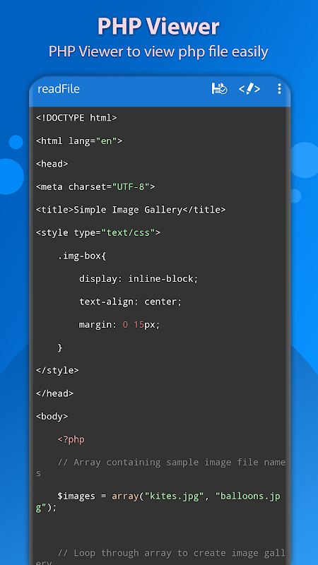 ویرایشگر PHP نمایشگر PDF خود را دارد که از طریق آن میتواند تمام فایلهای php تبدیل شده به پیدیاف را مشاهده کند و همچنین فایلهای پیدیاف دیگری را که میتوانند به راحتی از حافظه دستگاه انتخاب کنند، مشاهده کند. فایل خوان Php هم برای توسعه دهندگان و هم برای کسانی که می خواهند برنامه نویسی php را یاد بگیرند بسیار مفید است. می توانید کد منبع هر فایل php را مشاهده کنید و برنامه نویسی php را یاد بگیرید.