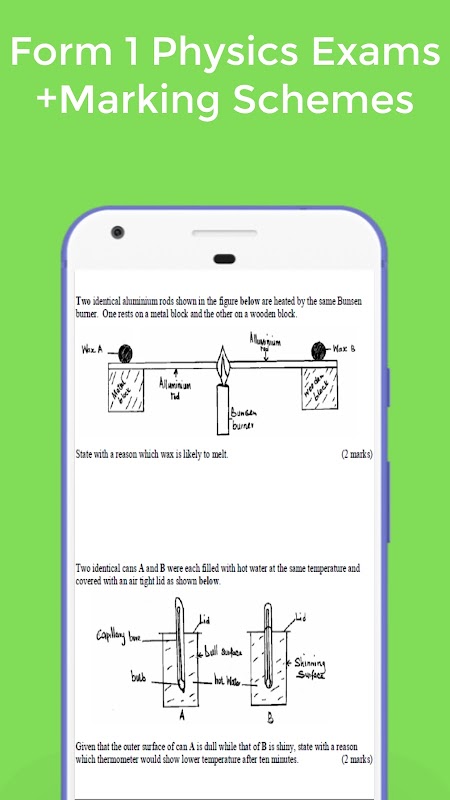 این نرم افزار امتحانات فیزیک فرم 1 را که دارای استانداردهای kcse هستند که به صورت دوره ای که ترم 1 و ترم 2 و ترم 3 است ، سازماندهی می کند و هر آزمون دارای طرح علامت گذاری است که می تواند برای علامت گذاری آن امتحان استفاده شود