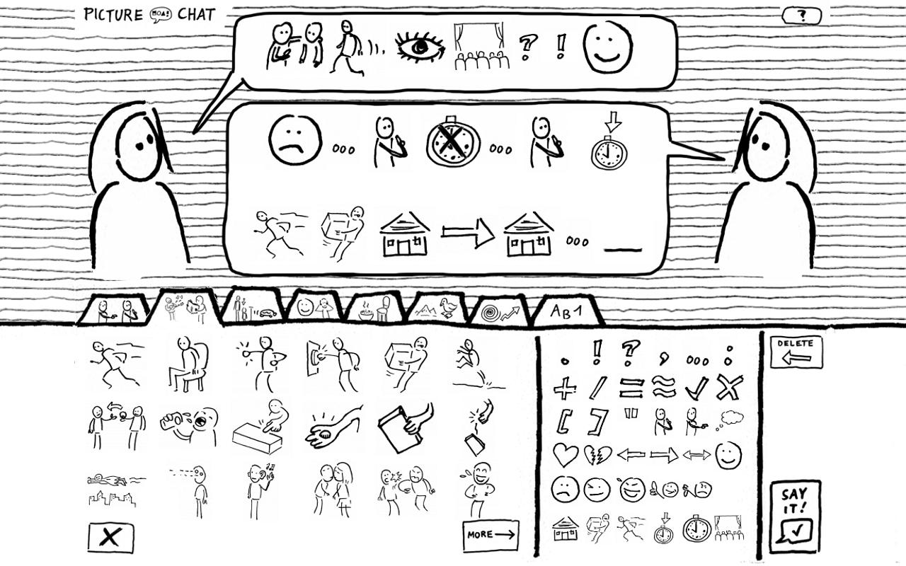 Welcome to Picture Chat, where you and a friend share a tablet to talk not by speaking... but by typing pictures! Turn by turn, a sentence is created by combining any of the over 500 images.