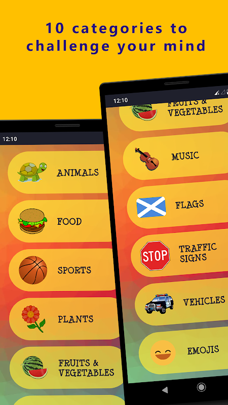 ✔️11 different categories to have fun with: Animals / Food / Sports / Plants / Fruits and Vegetables / Music / Flags / Traffic Signs / Vehicles / Emojis / Christmas